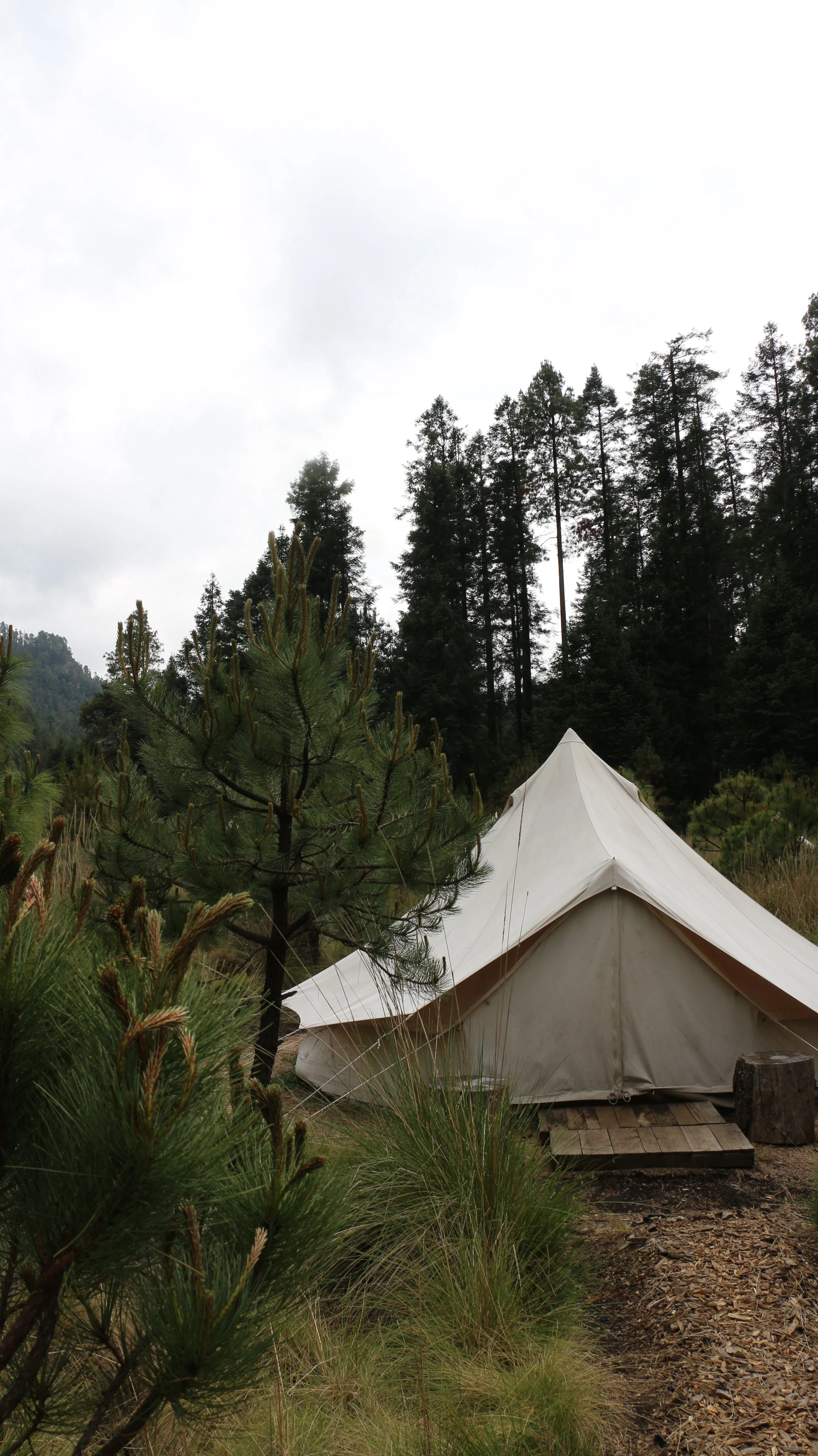 Tienda doble equipada con todo lo necesario para descansar cómodamente en medio del bosque.